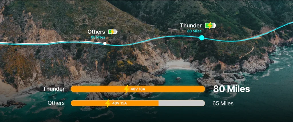 Together, the hydraulic brakes, lighting package, and UL certification make Thunder feel more like a purpose-built high-speed ebike than a budget fat-tire toy.