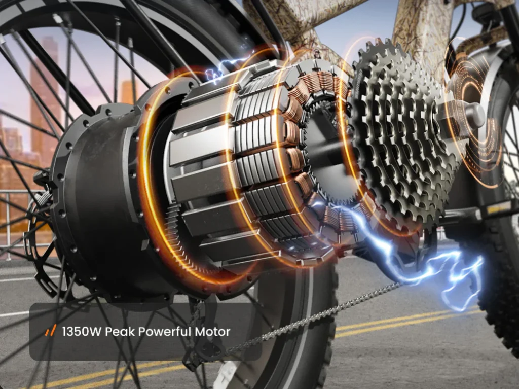 - 750W (1350W peak) rear hub motor with torque-focused assist for strong yet controlled power.