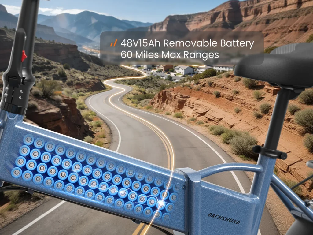 The Dachshund uses a 48V 15Ah battery, giving about 720Wh of capacity (48 × 15 = 720). That’s a healthy amount for a compact folder.
