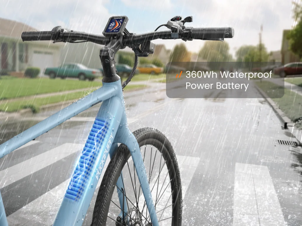 Power comes from a 36V 10Ah battery—about 360Wh of capacity. Puckipuppy calls this a “Range built for real life”, not a monster pack meant to win spec-sheet battles.