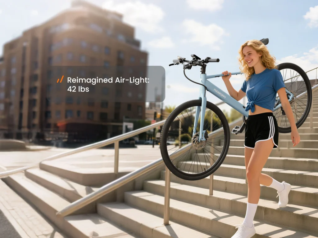• The 42 lb aluminum frame is nearly 30% lighter than many commuter ebikes in the 60–80 lb range. You feel that difference every time you pick it up, park it, or lift it onto a car rack.