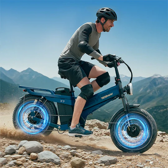 The Tesway X7 AWD is a dual-motor AWD e-bike aimed at riders who care most about traction, torque, and staying planted on rough property roads, loose gravel, and off-road routes. Tesway frames it around 3600W peak power, 200 N·m torque, a 52V 60Ah battery, and a 38 mph max speed claim—so it’s clearly built to feel more like an off-road power tool than a typical commuter e-bike.