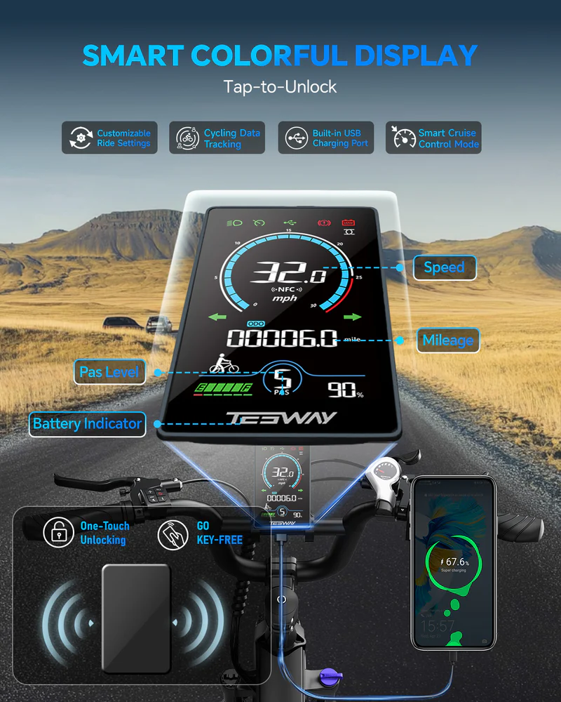 For control and security features, Tesway lists an LCD full-color display with NFC lock. You also get a front & rear light system, and the product page calls out an IPX6 waterproof design for the lighting system.