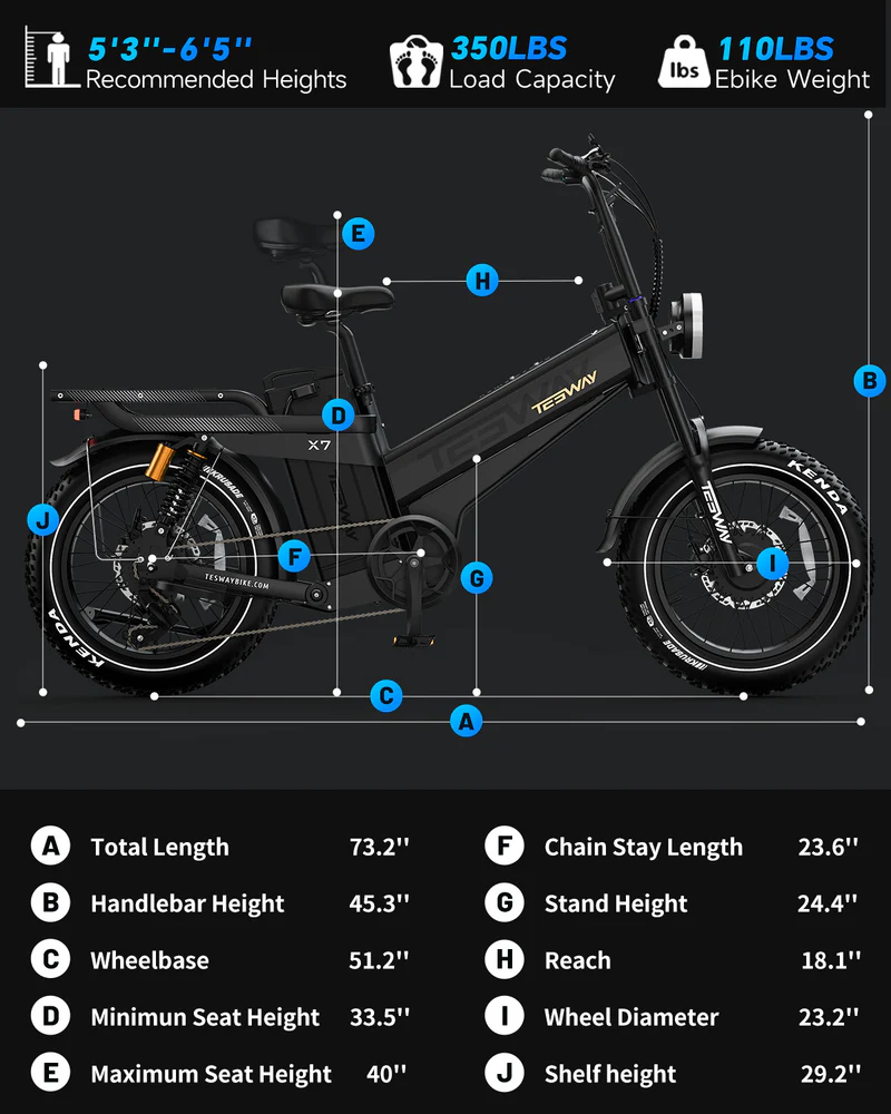 Tesway lists full suspension with a front hydraulic fork and rear spring suspension, which is a big deal for reducing fatigue on rough surfaces.
