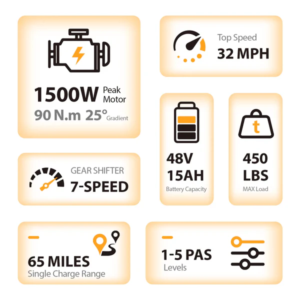 - A 1500W, 90 N·m rear hub motor and 48V 15Ah battery