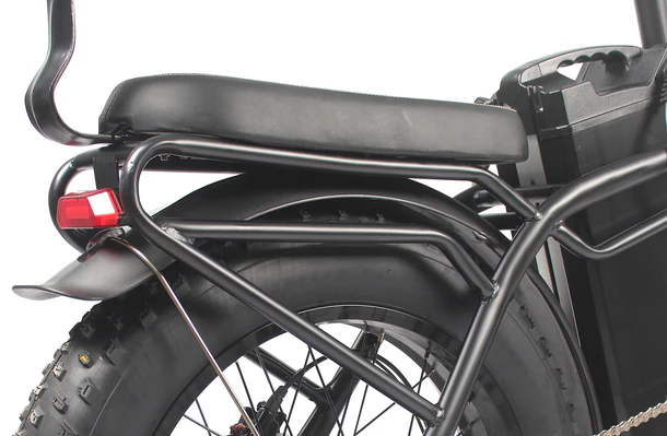 - Folding frame with 20″ x 4.0″ fat tires for compact storage and off-road-capable handling